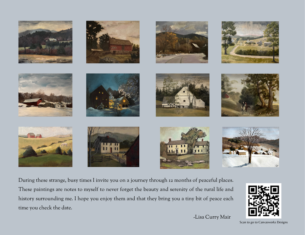 During these strange, busy times I invite you on a journey through 12 months of peaceful places. These paintings are notes to myself to never forget the beauty and serenity of the rural life and history surrounding me. I hope you enjoy them and that they bring you a tiny bit of peace each time you check the date. -Lisa Curry Mair